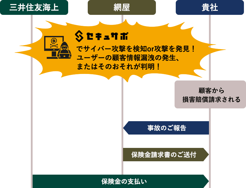 | 保険金支払条件 | セキュサポが監視しているエンドユーザーのサーバ・ネットワーク機器類が、サイバー攻撃を受けて発生した、サイバーセキュリティに関する事故に限る |